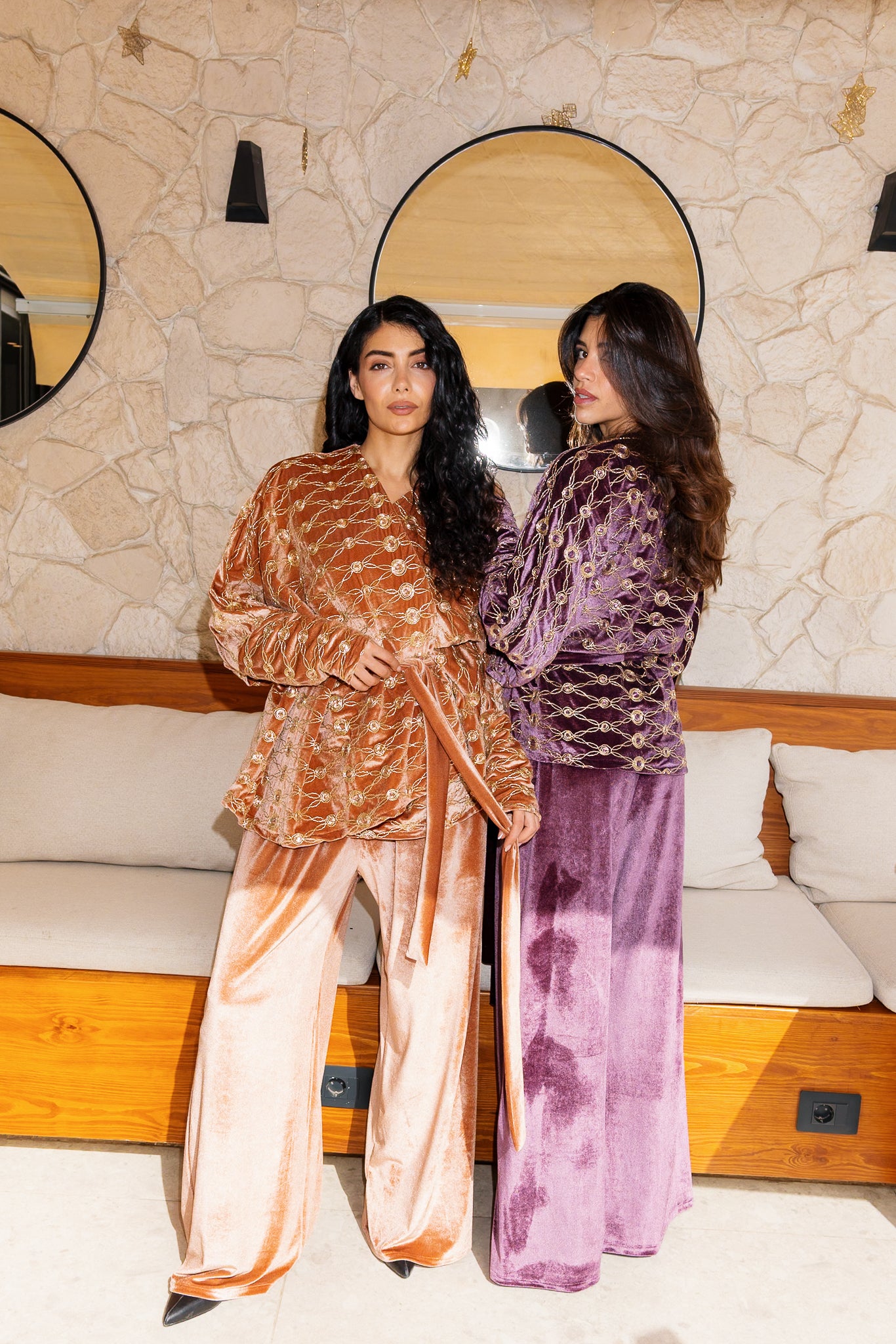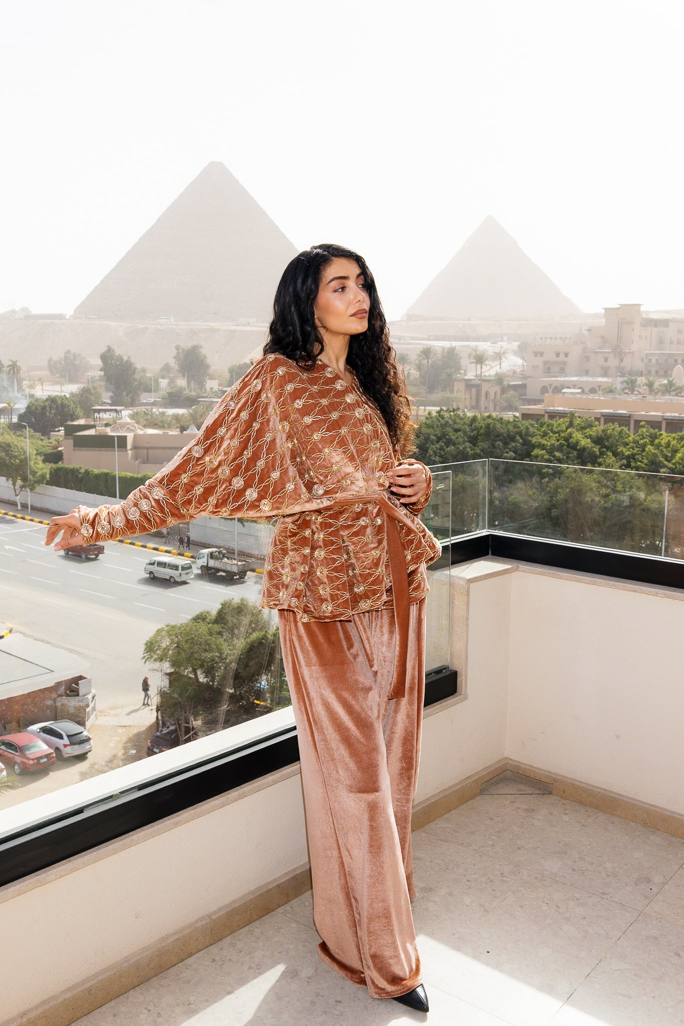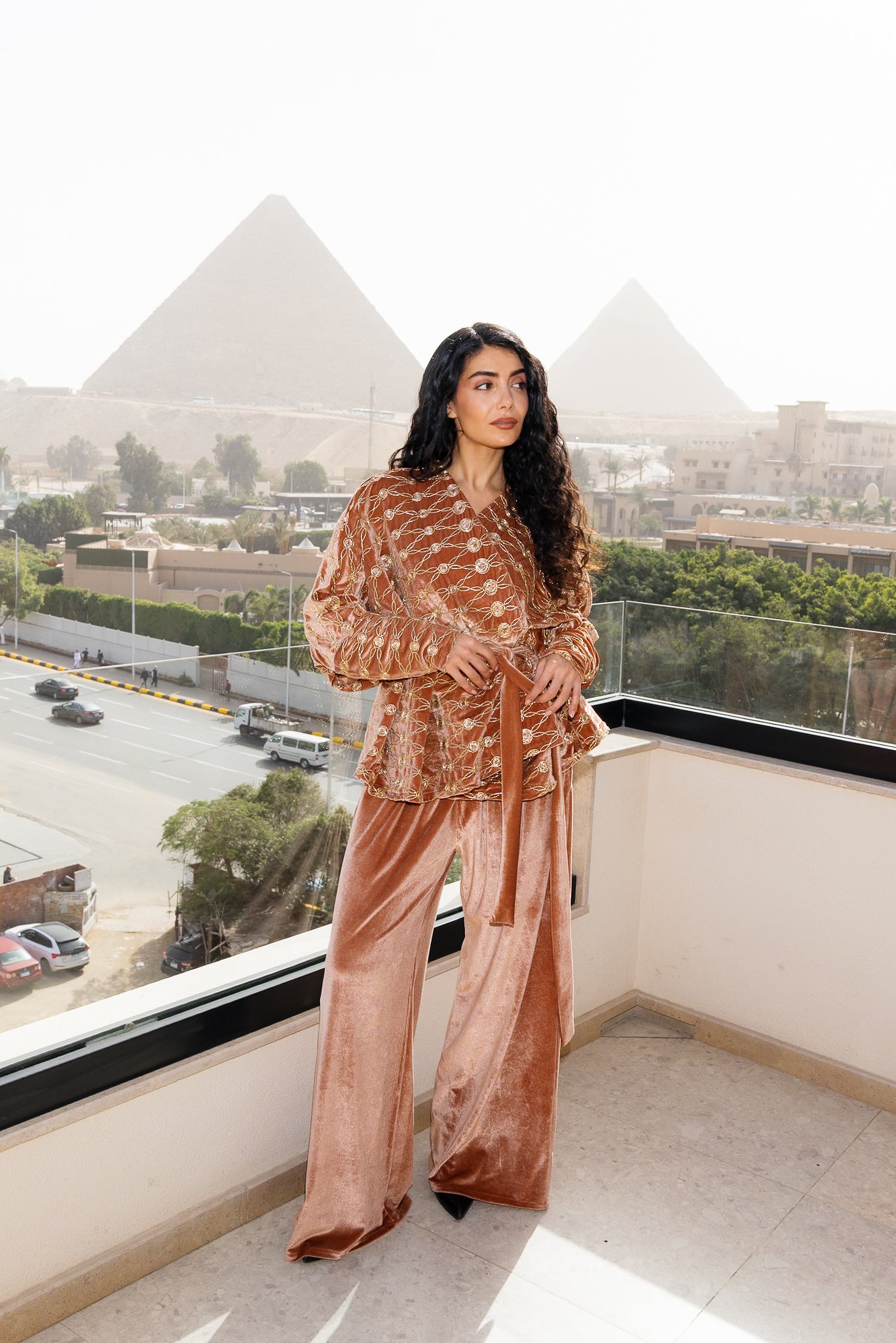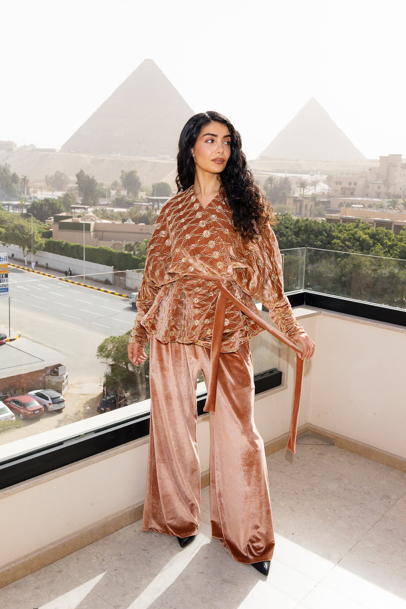 A hand-embroidered velvet cardigan with a waist belt, paired with plain velvet pants for a refined, elevated look.