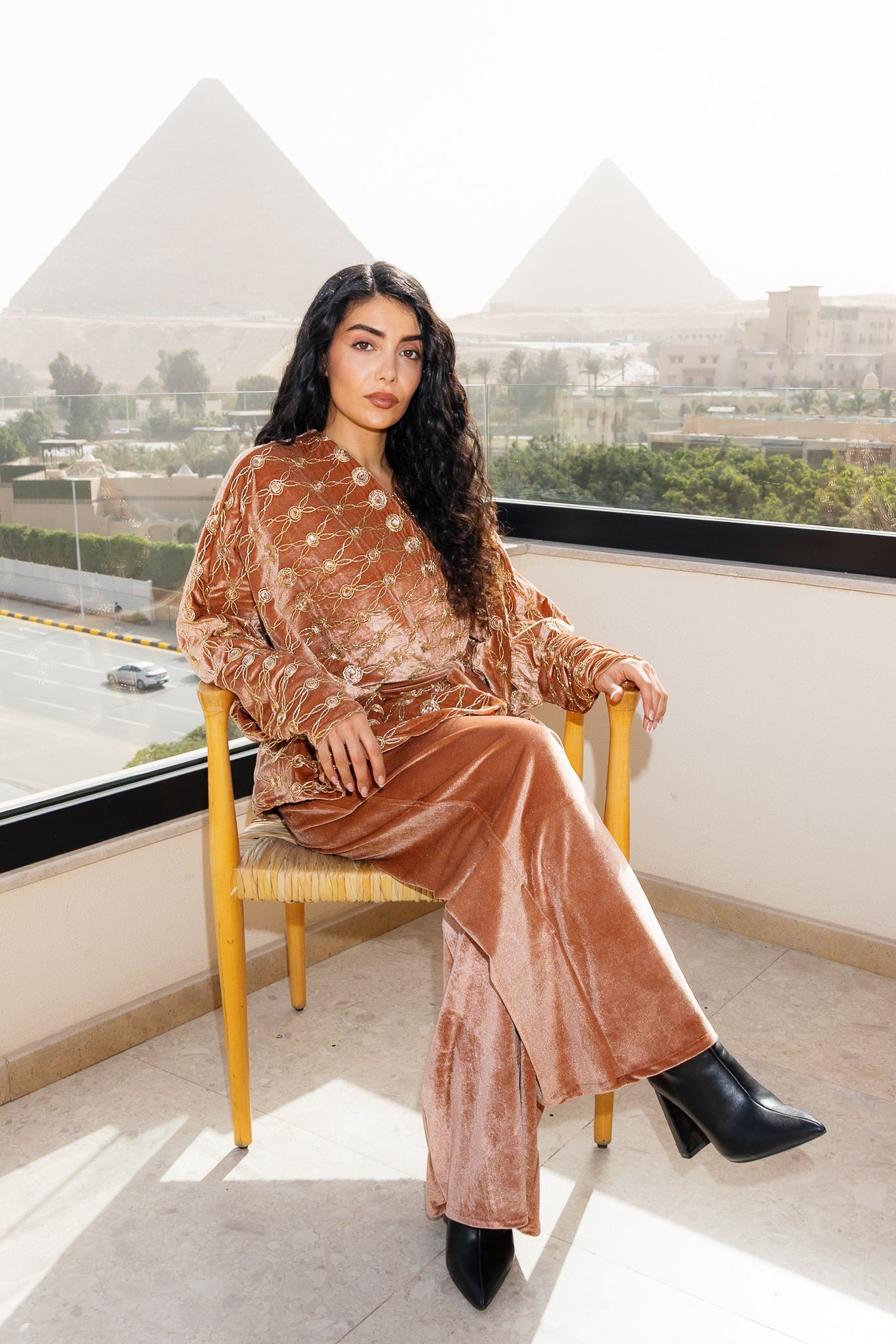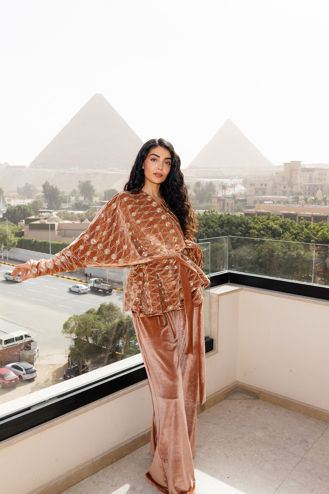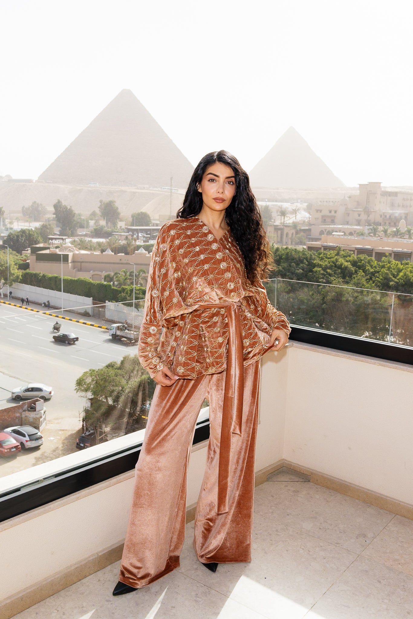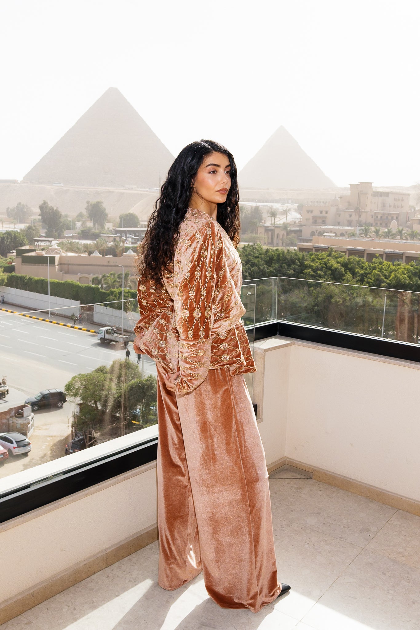 A hand-embroidered velvet cardigan with a waist belt, paired with plain velvet pants for a refined, elevated look.