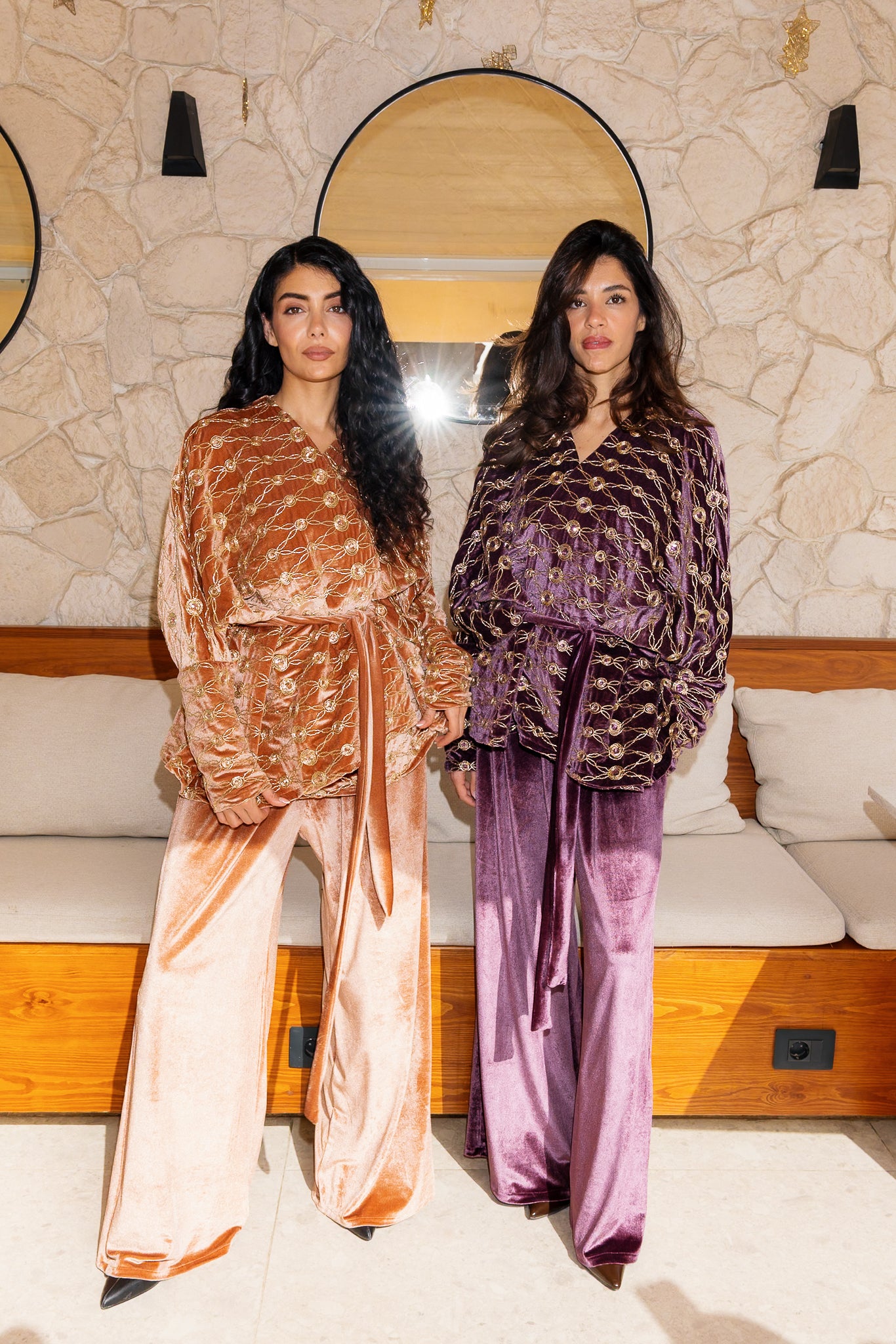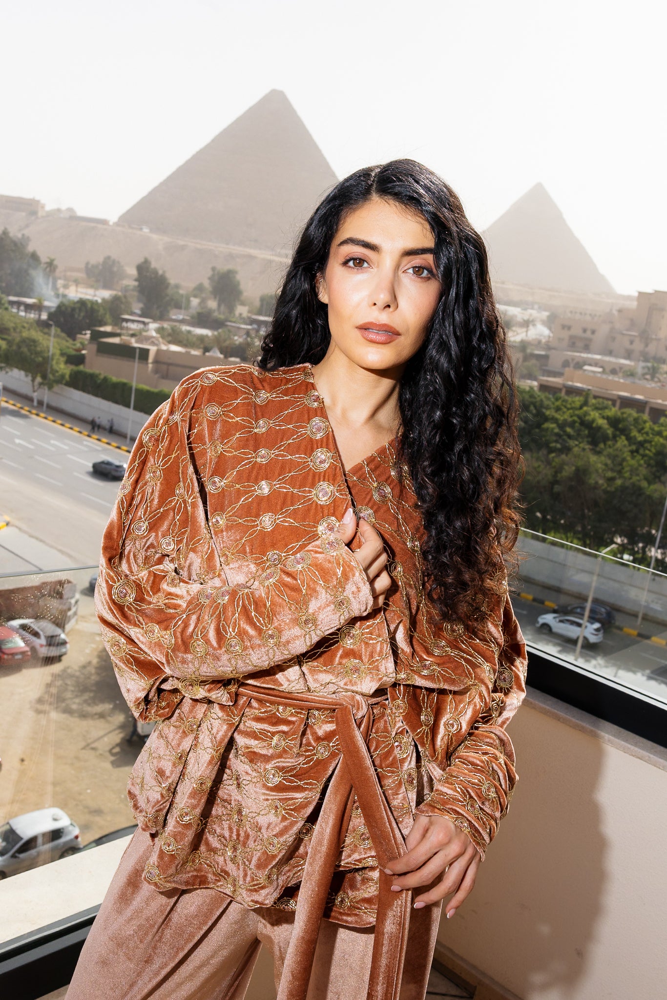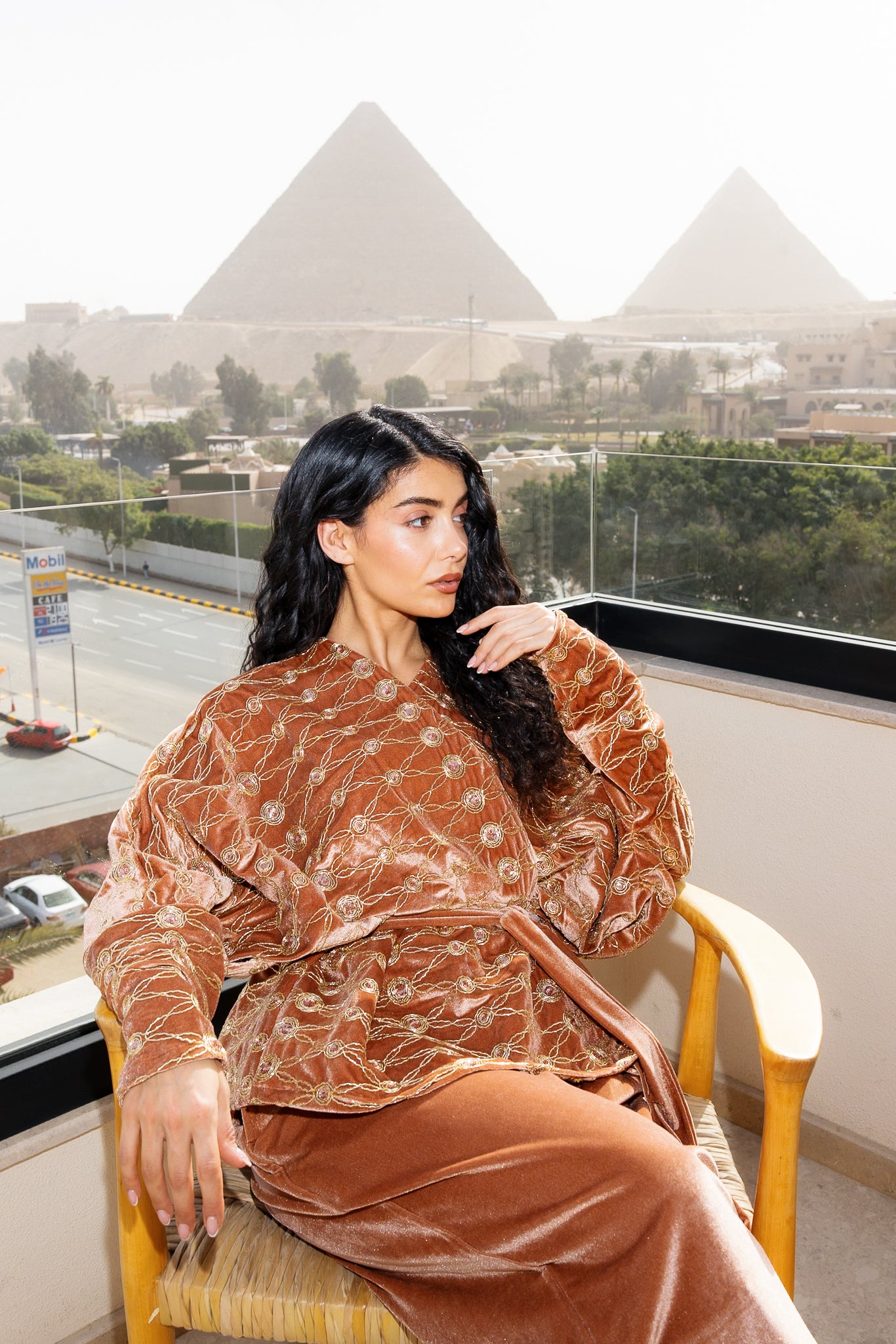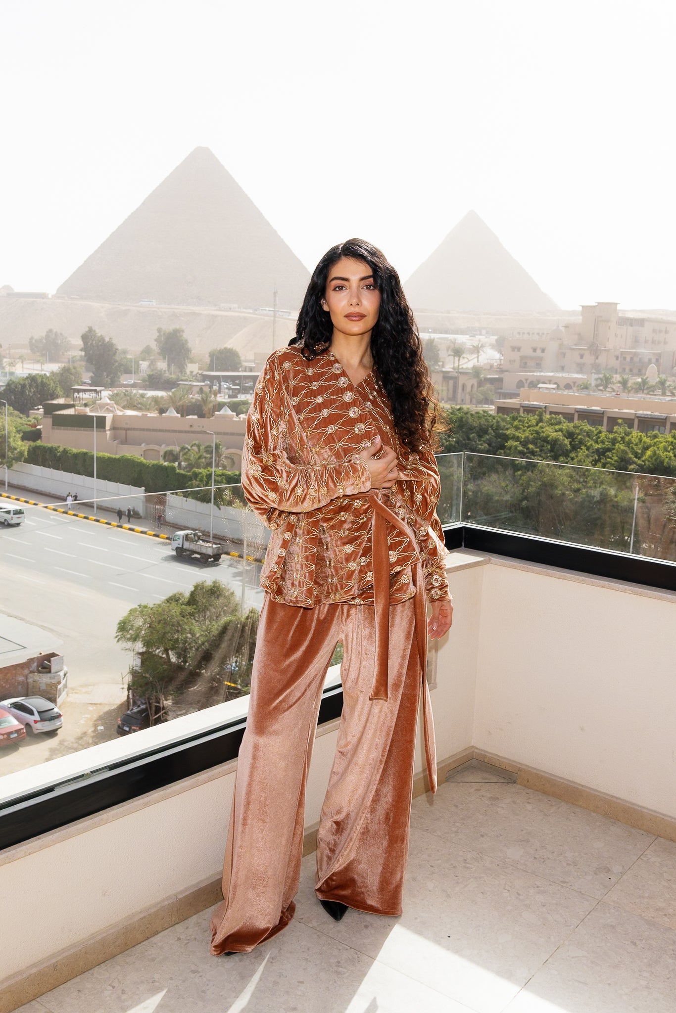 A hand-embroidered velvet cardigan with a waist belt, paired with plain velvet pants for a refined, elevated look.