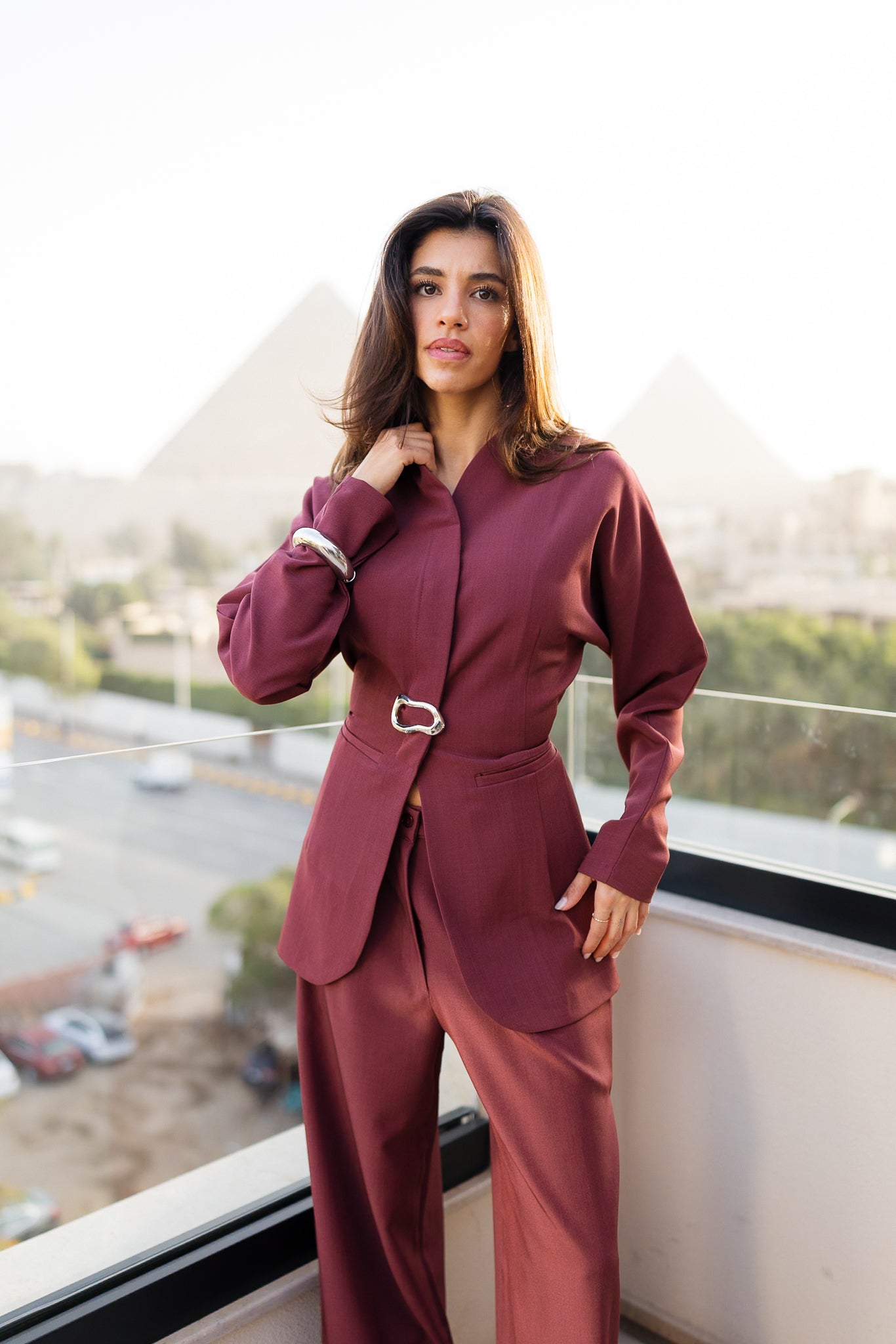 A sleek, contemporary set with a collarless blazer, adjustable belt, and wide-leg trousers. The detachable gold pin adds an edgy, refined detail for a standout Ramadan look.